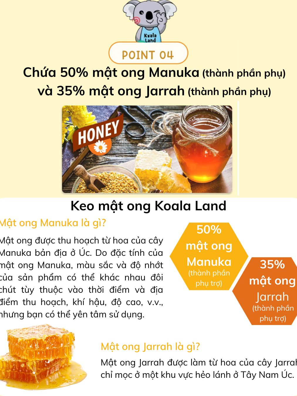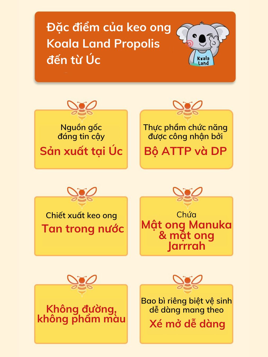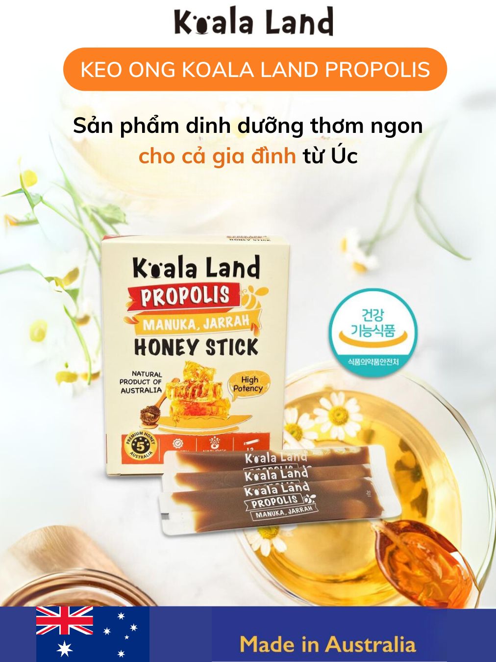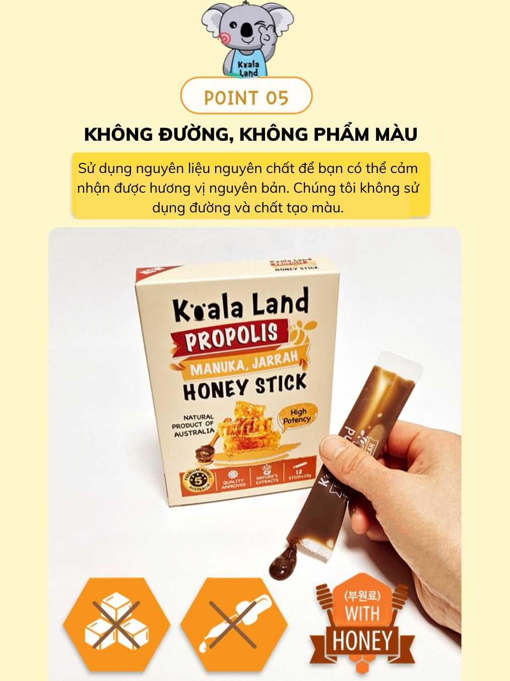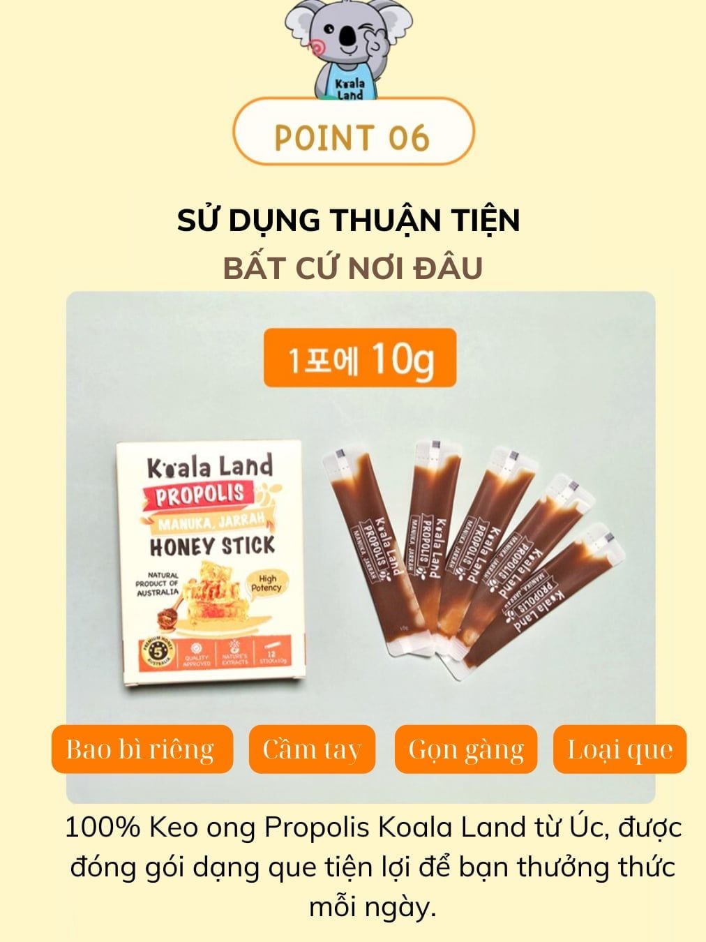 Keo ong dạng gói Koala Land Propolis Honey Stick, 12 góix10g, kháng khuẩn khoang miệng, chứa mật ong